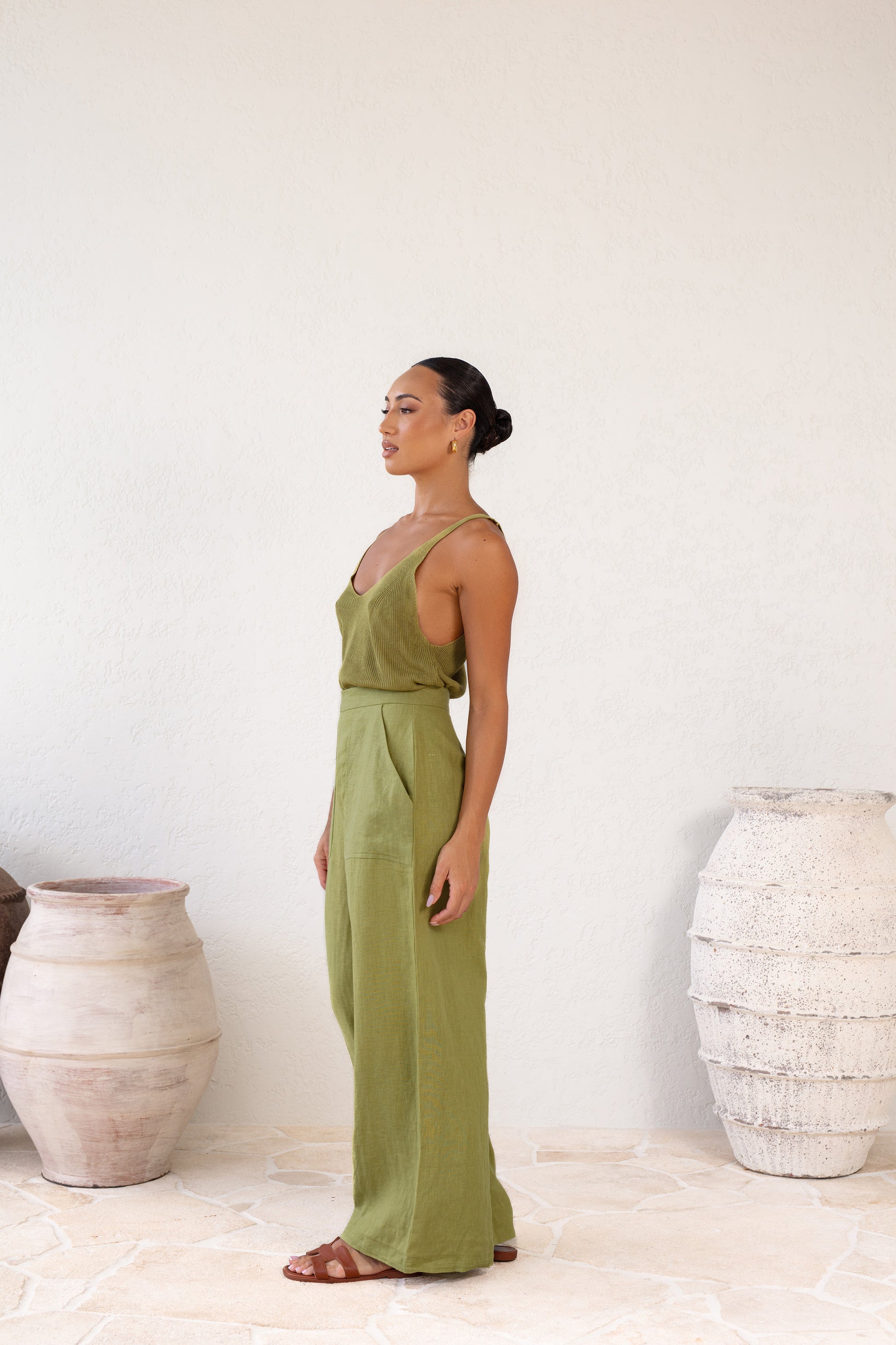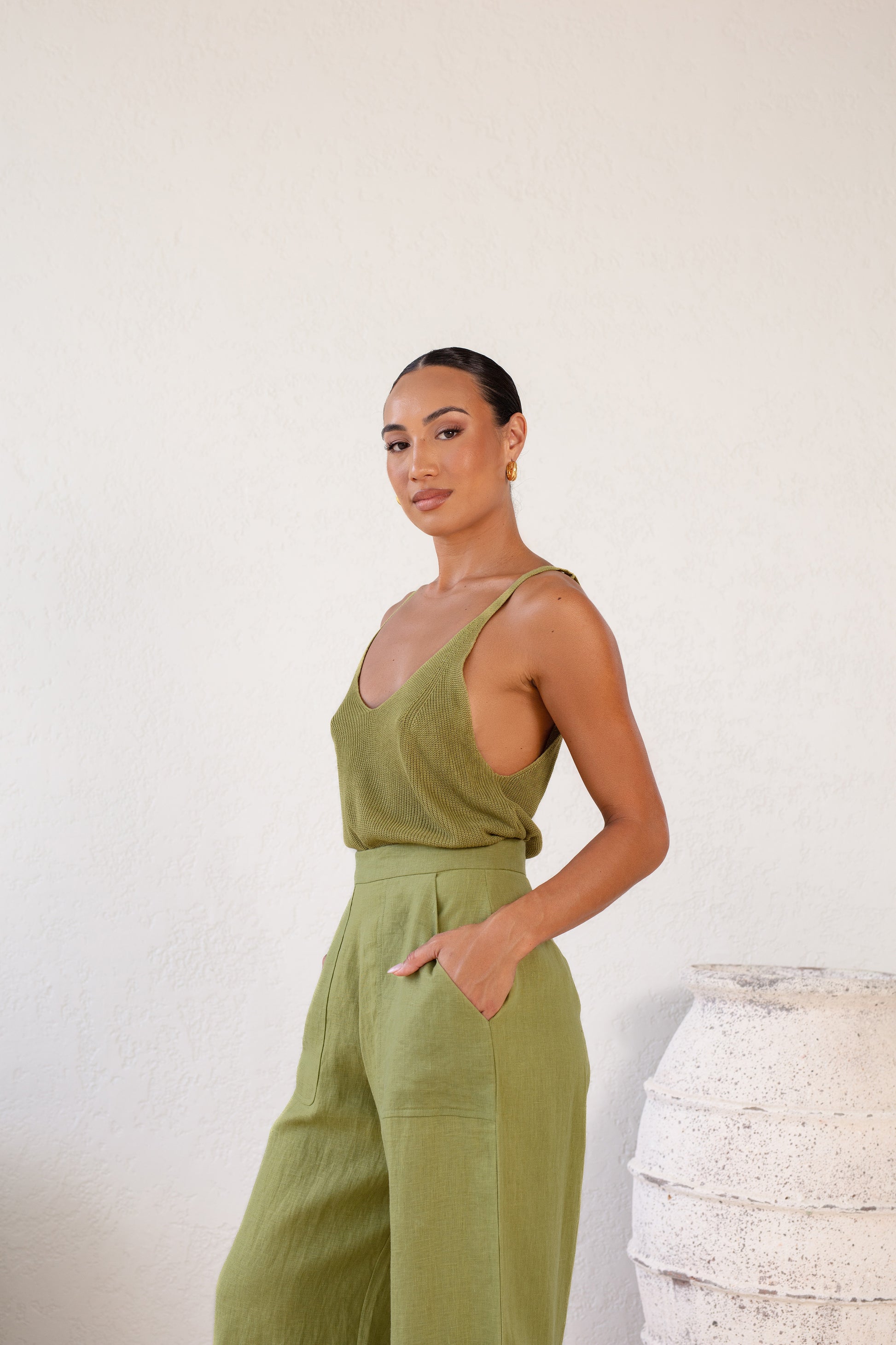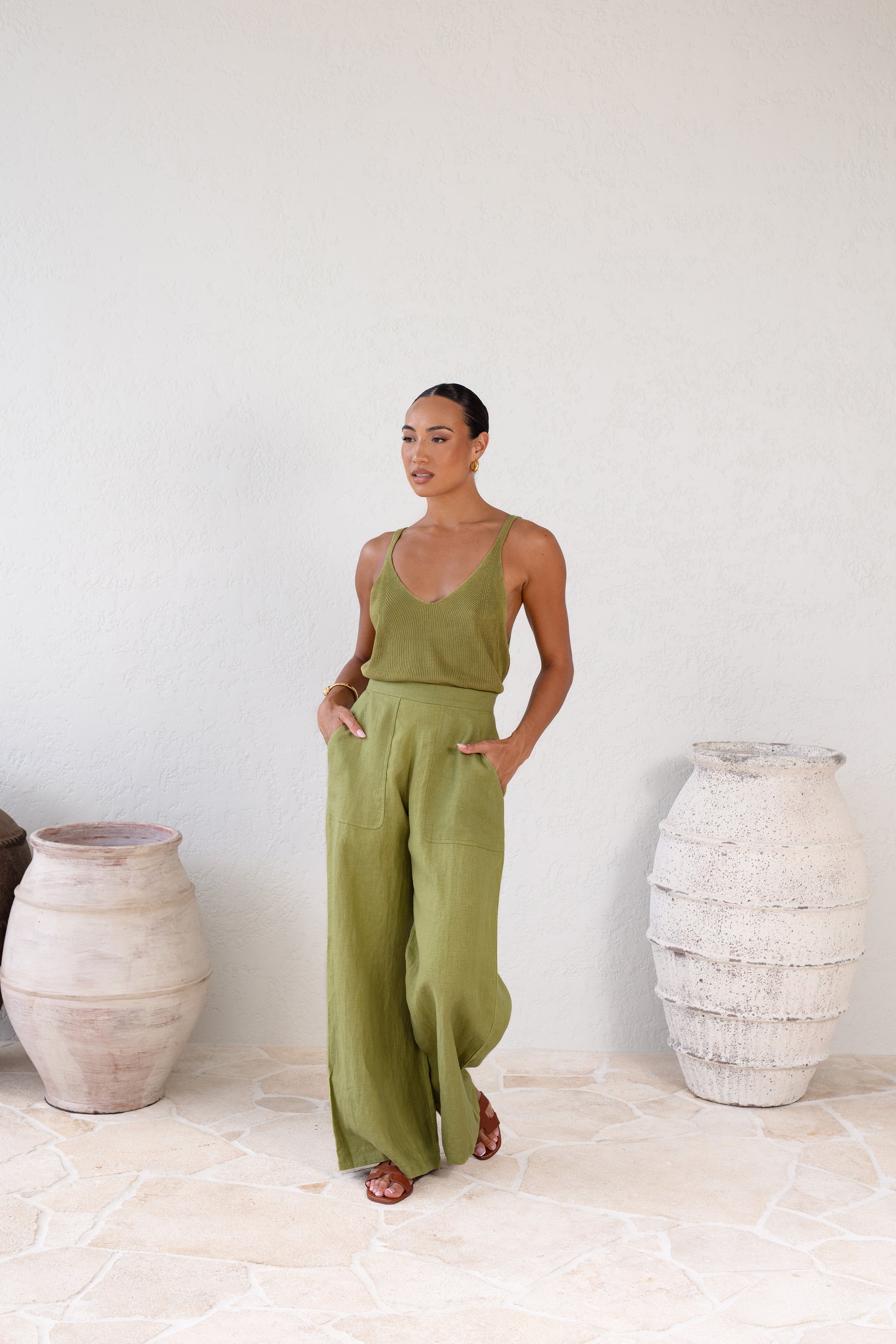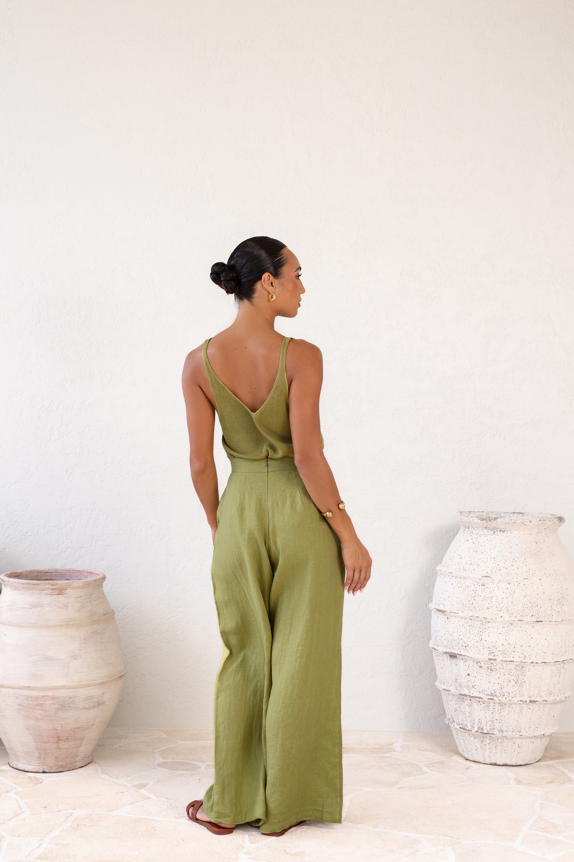 Our model wears The Trulli Linen Trousers in AU size 8, UK size 8, US size 4.